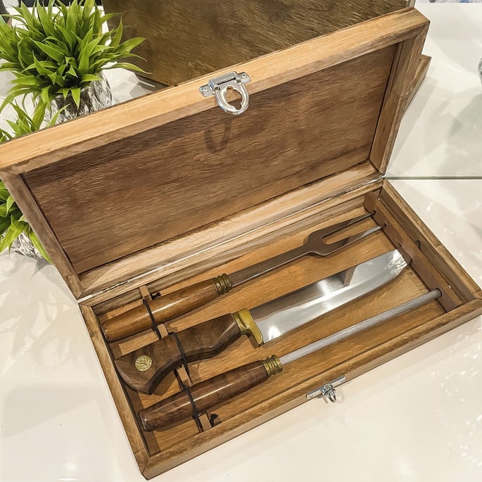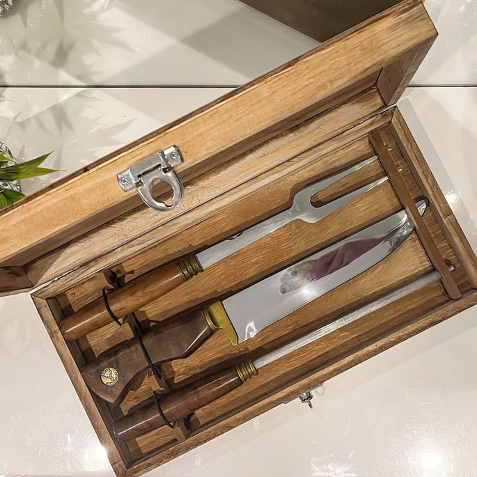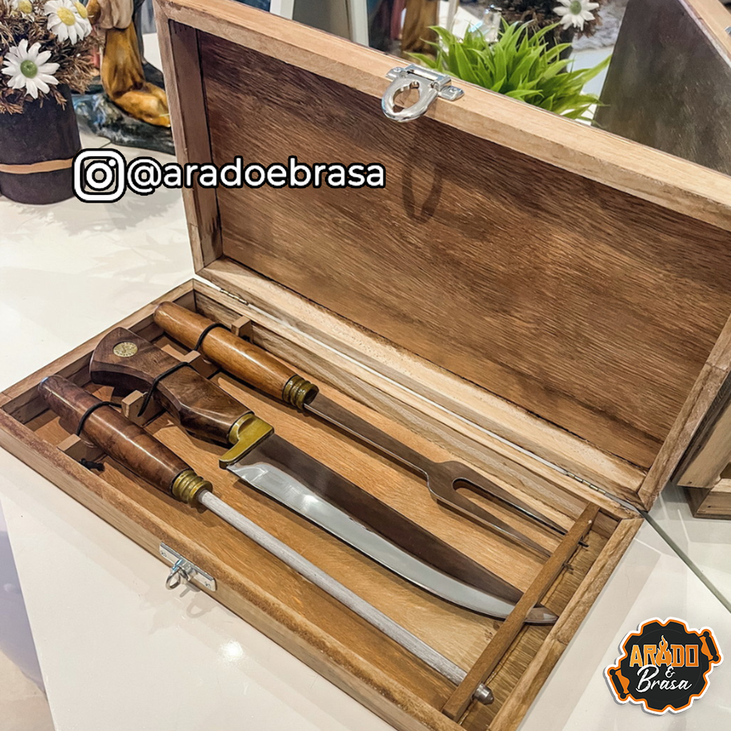 O Conjunto contém uma faca artesanal de 8 polegadas, 01 cadeira e 01 garfo.