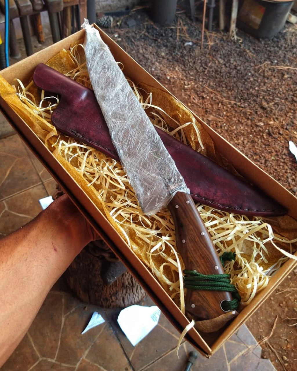 Elaborada com um disco de arado Tatu, que combina tradição e funcionalidade. Seu cabo, feito em cerne de Guajuvira, proporciona não apenas resistência, mas também um toque estético único.