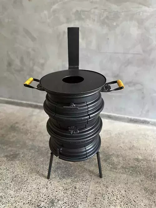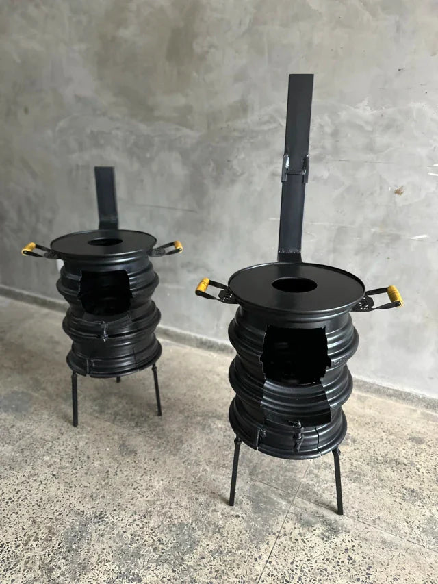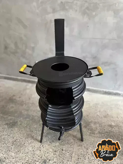 - Fogareiro robusto: Construído com 3 rodas de ferro, possui aberturas para lenha e cinzas, garantindo que as cinzas não caiam no chão.